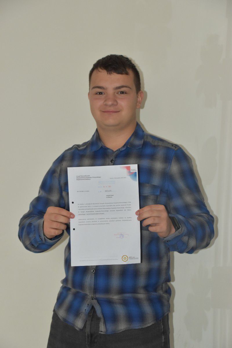 30.11 2023 Miło nam poinformować, iż Oskar Lipowski, uczeń klasy III Technikum został Stypendystą Marszałka Województwa Kujawsko-Pomorskiego. Serdecznie gratulujemy osiągnięć w nauce i życzymy dalszych sukcesów.